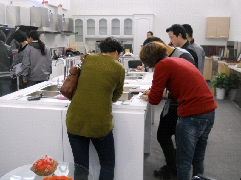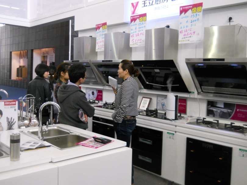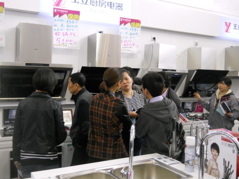 (體驗玉立常規廚電的顧客們并商量著下訂單)