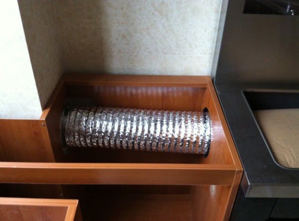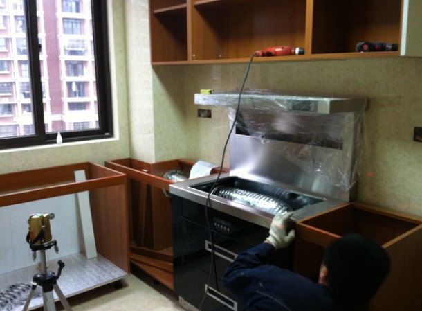 將櫥柜的柜體組裝好后和玉立分體集成灶擺放到合適的位置,根據排風管的位置然后在柜體的上開孔,然后從集成灶的內部將排風管拉出,與公共煙道預留的止回閥連接上,并用鋼箍擰緊。(止回閥在貼瓷磚之前就要和裝修師傅說過,把上方原有的公共煙道孔堵住,在中心孔離地面665mm的位置開孔,貼好瓷磚后再將止回閥安裝好,以便后期維護方便)
